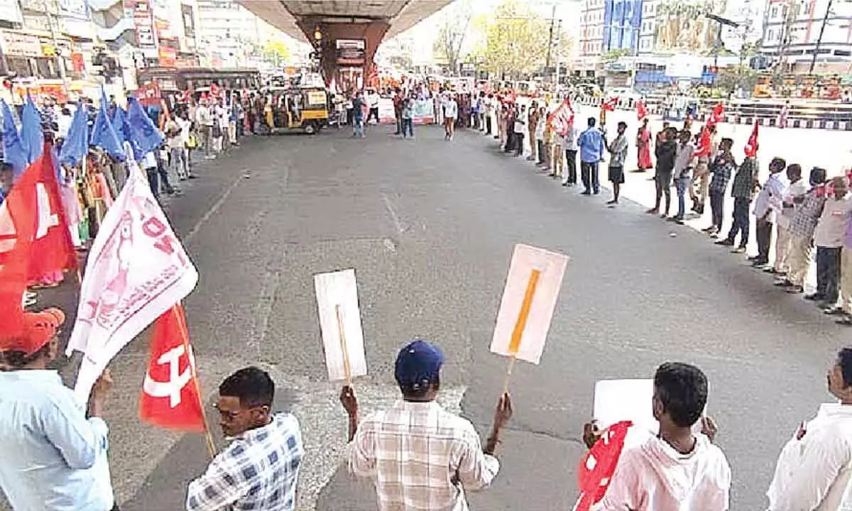 A rally was organised under the aegis of labour unions’ joint action committee here on Friday from GVMC Gandhi statue to the Gurajada statue. Later, a human chain was formed at the RTC Complex junction.