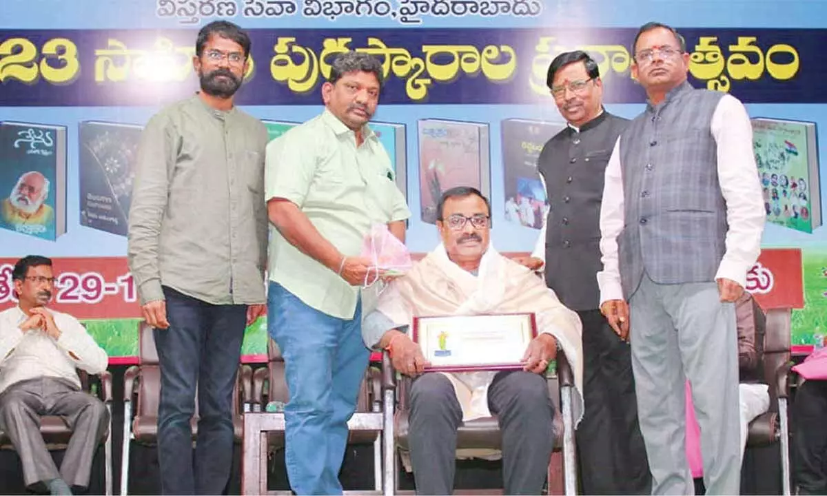 Tirupati: Former Professor of SV University Peta Srinivasulu Reddy (Petasri) was presented with Telugu University Literary Award by Suravaram Pratap Reddy Telugu University, Hyderabad, on Wednesday. The award was conferred in recognition of his acclaimed short story collection ‘Tirupati Kathalu’, which was recently selected for university’s annual literary honour.