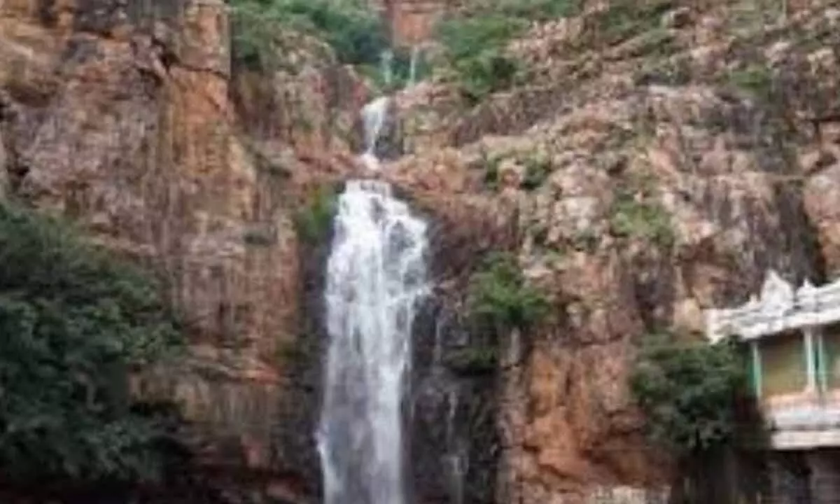 With the waterfall flowing vigorously, authorities have restricted devotees from bathing in the Pushkarani, ensuring safety amidst the heightened water levels.