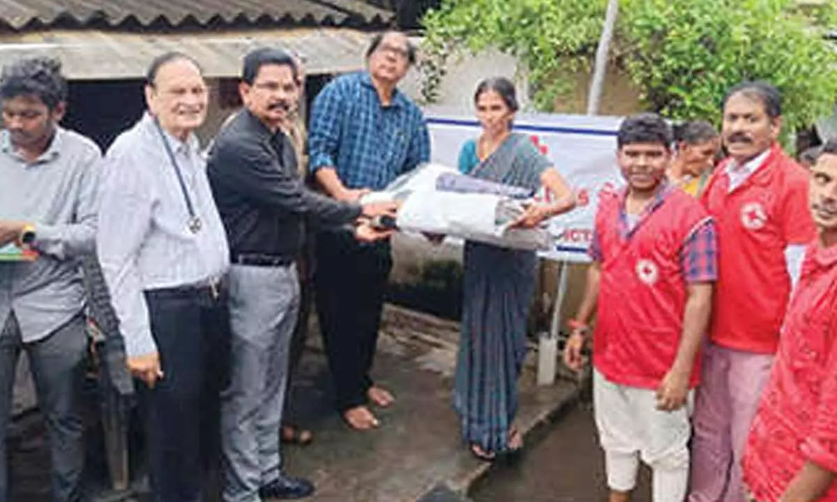 Vijayawada: Demonstrating its humanitarian spirit, the Indian Red Cross Society (IRCS) NTR District Committee has extended wide-ranging relief services to families affected by flooding in several low-lying areas of Vijayawada. Responding promptly to the distress caused by the recent heavy rains and cyclone impact, Red Cross teams distributed essential materials and conducted extensive field visits on Wednesday. Under the leadership of Dr Goparaju Samaram, chairman of IRCS NTR District Committee, along with Vice-Chairman Dr Velaga Joshi, Secretary Chittibabu, and member Balaram, the team visited flood-affected colonies and interacted with residents to assess their immediate needs.