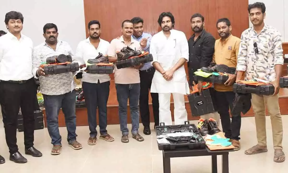Speaking at a meeting with 325 private electricians from across the Pithapuram constituency at his camp office in Mangalagiri, Pawan Kalyan distributed safety kits designed to protect them in their workplaces. Each kit includes essential electrical tools, rubber gloves, safety shoes, and a jacket.