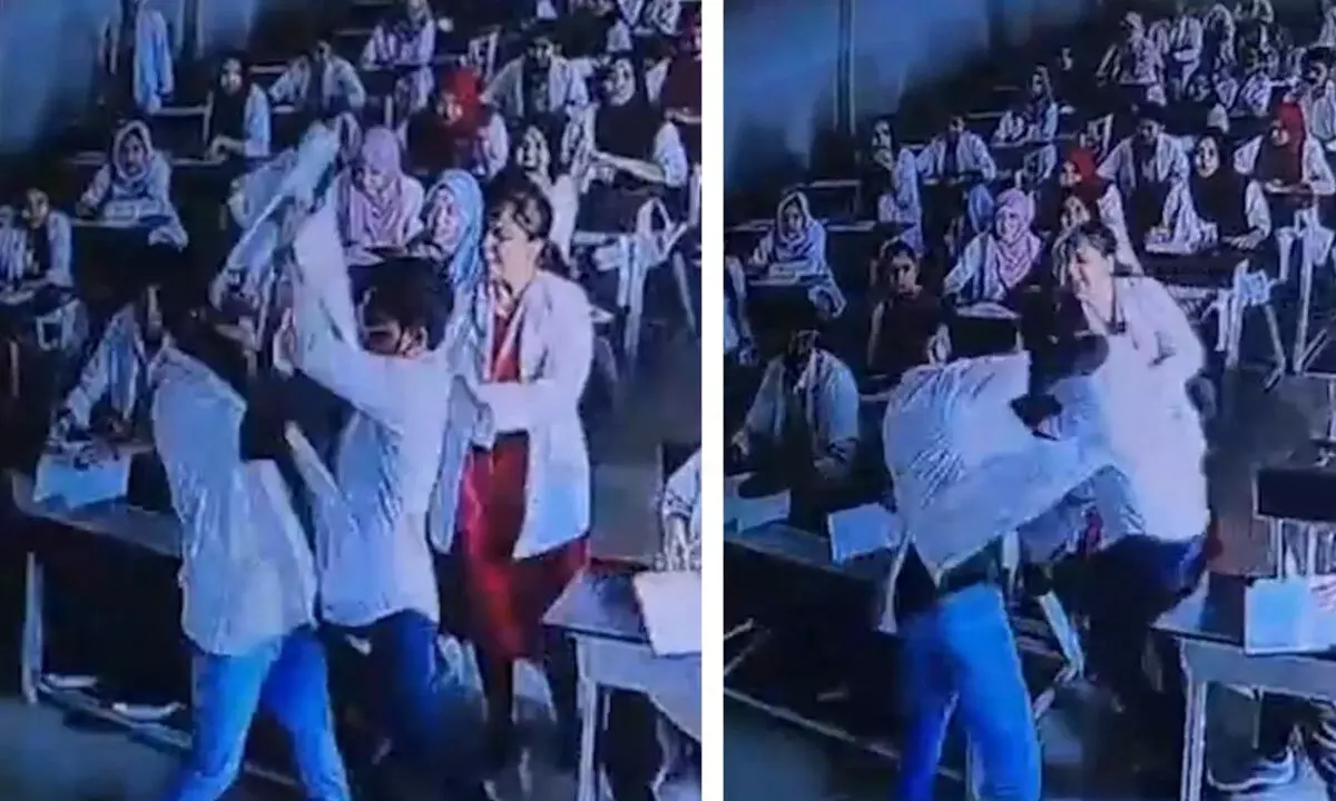 An internal examination at a homeopathic college in Karnataka turned violent when a student allegedly assaulted an invigilator who caught him cheating. The incident, recorded on CCTV inside the examination hall, took place at Dr Malakareddy Homeopathic College in Kalaburagi.