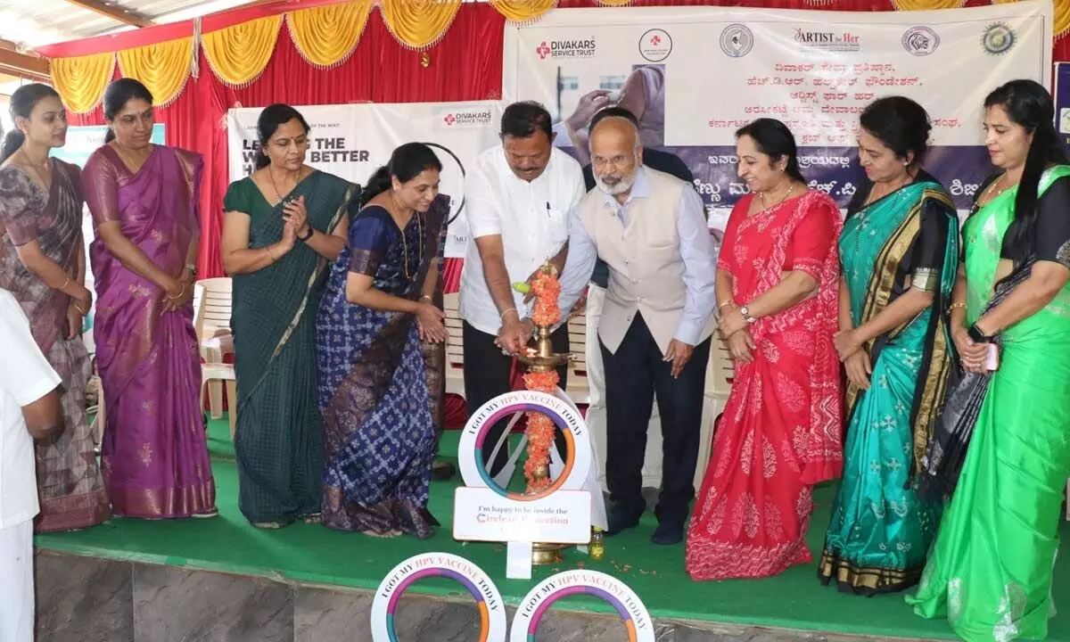Former Arakalagudu MLA and President of the Arasikatte Amma Temple Trust, Shri A.T. Ramaswamy, along with Dr. Bharathi Rajshekar, President of the Karnataka State Obstetrics and Gynaecology Association (KSOGA), Dr. Girija B.S., President of the KSOGA Hassan Chapter, Dr Sowmya Mani and Dr. Savithri A., Coordinators of the HPV Vaccination Program, graced the event.