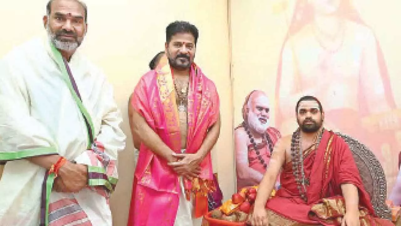 Hyderabad: Chief Minister A Revanth Reddy paid a courtesy call on Sringeri Jagadguru Sri Sri Sri Vidhushekhara Bharathi swamy at Nallakunta Shankara Math in Hyderabad on Tuesday . Sri Sri Sri Vidhushekhara Bharathi swamy is on a visit to Hyderabad as part of the ‘Dharma Vijaya Yatra’.