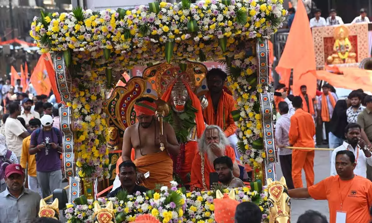 Another tributary procession started from Karmanghat’s Hanuman temple under Rachakonda Commissionerate and after passing through Champapet, Saidabad, Saroornagar, Dilsukhnagar and Chaderghat joined the main procession, as the residents welcomed the procession with slogans.