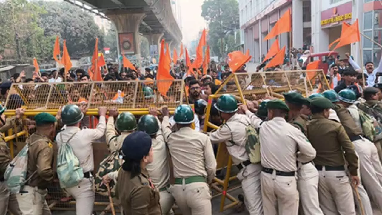 A brief scuffle took place between VHP and Bajrang Dal protesters and police personnel during the attempt to move forward, though the situation was later brought under control.