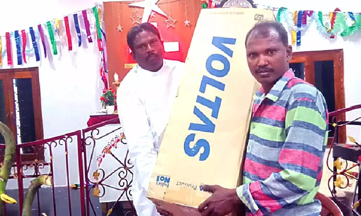 Vijayawada: In a noble gesture, auto driver Parasa Suresh, who operates his vehicle on a rental basis, along with his wife Joshna, presented a water cooler to the CSI Church at Nunna in Vijayawada Rural mandal on Thursday. The couple formally handed over the water cooler to Church Father John Wesley in the presence of devotees and members of the local Christian community.