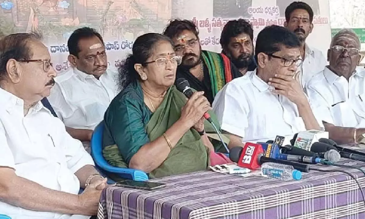Photo caption: Trustees of Sri Dharmasasta Spiritual Centre Jakkampudi Vijayalakshmi, Challa Shankara Rao and others at a press conference on Monday