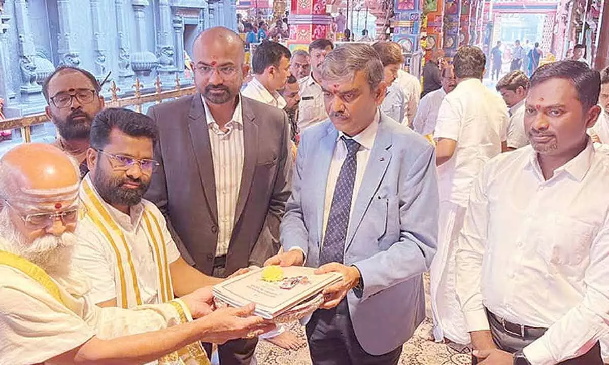 The finance department principal secretary, Piyush Kumar, led the delegation. Other senior officials who participated in the ceremony included secretary D Ronald Rose, Suraj Ganore, and Gautam Allada. On arrival, the officials were accorded a warm welcome by temple executive officer and special grade deputy collector V K Seena Naik, who received them and escorted them to the sanctum sanctorum for darshan