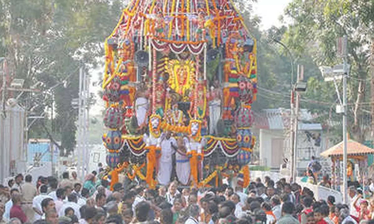 Tirupati: Festive fervour marks the grand Rathotsavam amidst Mangala Vaidyams and resonating chants of “Govinda’’ on the eighth day of the annual Brahmotsavams of Sri Kalyana Venkateswara Swamy Temple on Sunday.