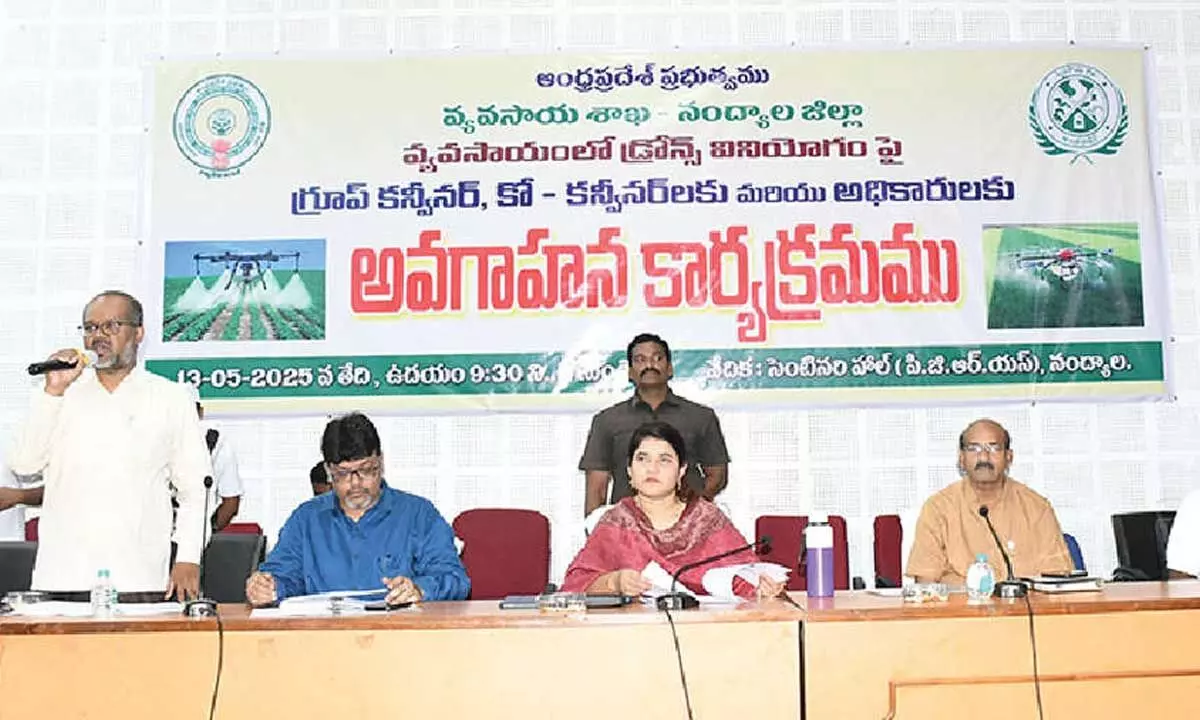 Nandyal: District Collector G Raja Kumari underscored the transformative potential of drone technology in revolutionizing the agricultural sector. Speaking as the chief guest at an awareness program held at the PGRS Hall in the Collectorate on Tuesday, she addressed officials, FPO representatives, and group conveners on the use of Kisan drones in farming.