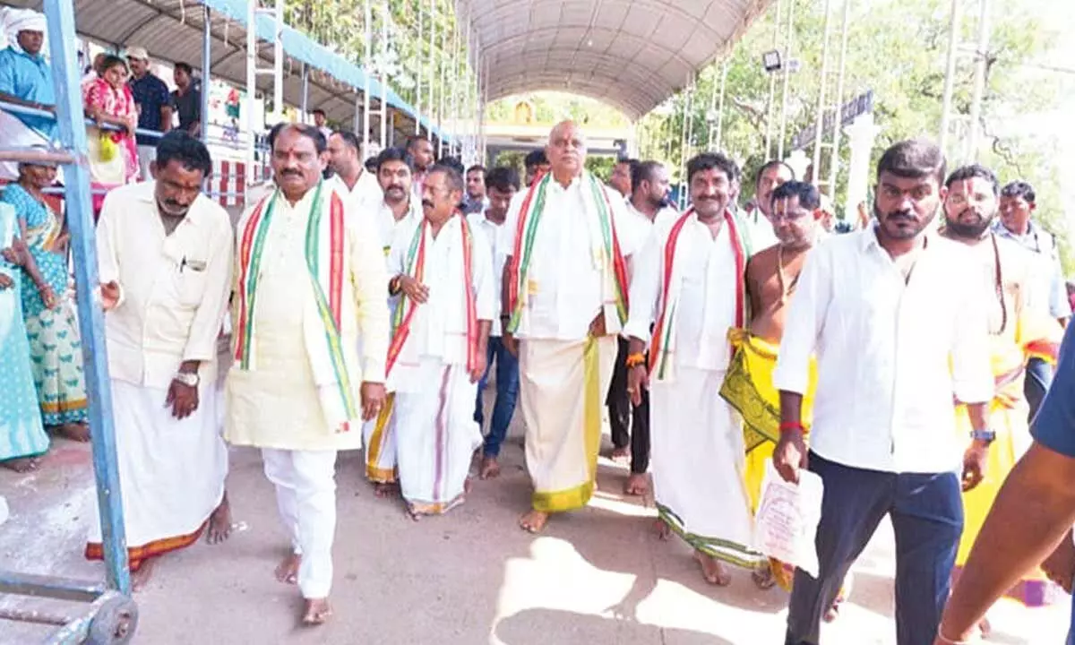 Earlier the MP has received warm welcome in a traditional manner by temple authorities Pandits chanting Vedic hymns. Party leaders were also present.
