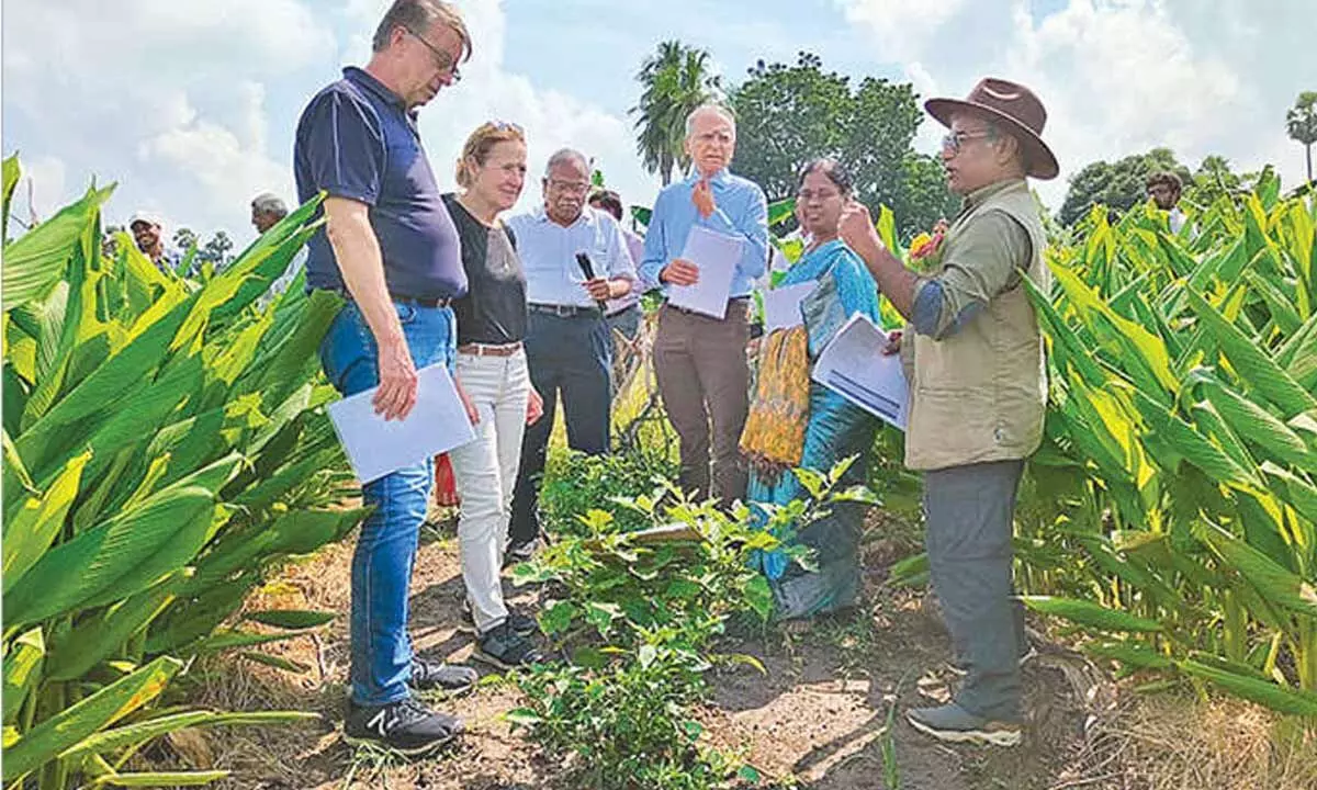 Guntur: Executive vice chairman of AP Rytu Sadhikara Samstha K Vijay Kumar said intercropping and mulching with crop residues significantly improve water retention and soil fertility. He along with an international delegation went to natural farming fields managed under AP Community-managed Natural Farming (APCMNF) initiative implemented by Rythu Sadhikara Samstha at Nutakki village under Mangalagiri mandal in the district on Saturday.