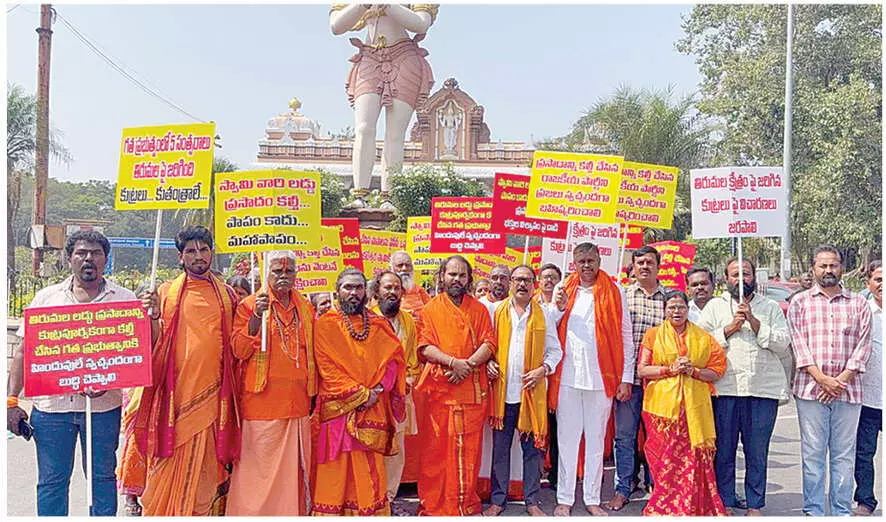 Chanting slogans and performing traditional rituals, including breaking coconuts and offering prayers, the protesters said the reported adulteration of Srivari Laddu prasadam was an unforgivable act. They stressed that prasadam holds deep spiritual significance and any interference with it amounts to an attack on the faith of millions of devotees.
