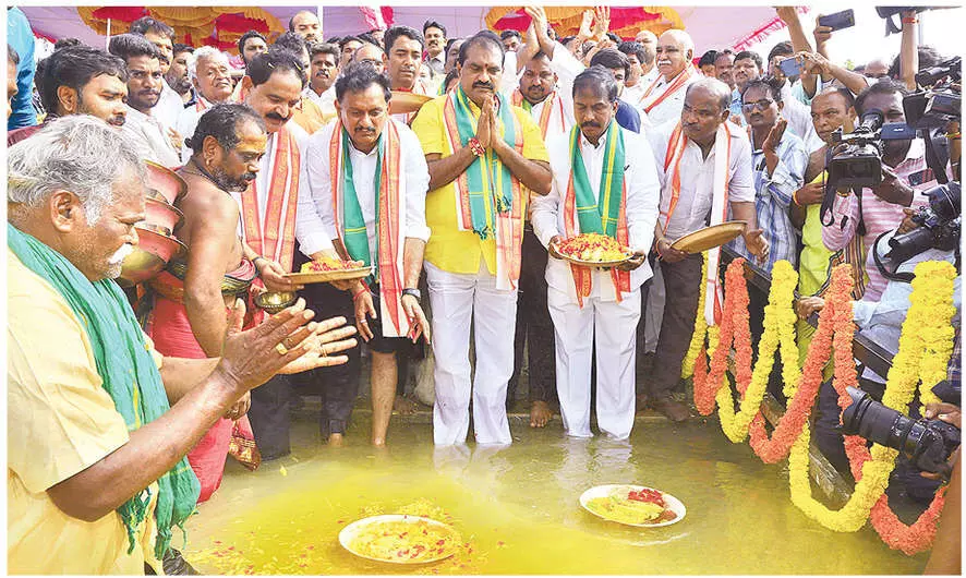 Vijayawada: Water Resources Minister Nimmala Ramanaidu, Vijayawada MP Kesineni Sivanath, Jaggaiahpet MLA Sriram Rajagopal, NTR District Collector G Lakshmisha and others conducted traditional rituals and offered Jala Harathi to the waters of the Godavari at the sacred confluence of two rivers in Ibrahimpatnam near here on Wednesday.