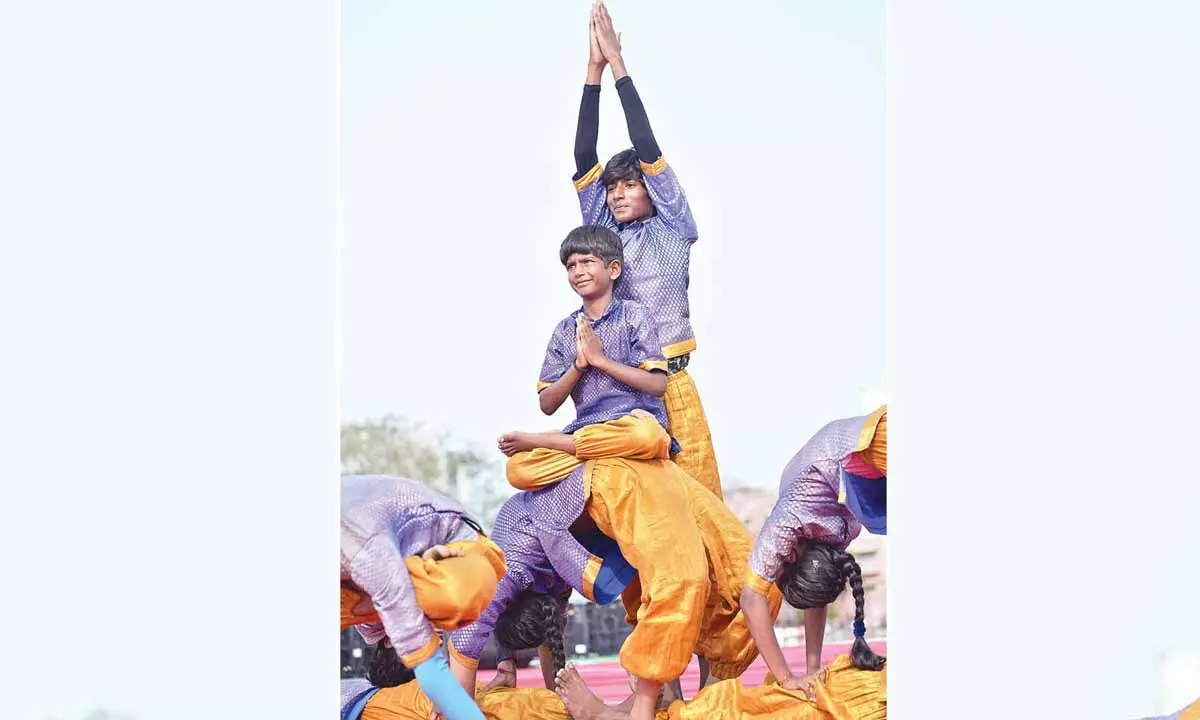 Bhimavaram: As part of Yogandhra, a mega yoga demonstration was organised at DNR College here on Thursday under the auspices of district collector Chadalawada Nagarani with a special theme of athletics, sports groups and youth groups assigned to the district. The programme was attended by Union Minister of State for Steel and Heavy Industries Bhupathi Raju Srinivasa Varma, Deputy Speaker of the Legislative Assembly and Undi MLA Kanumuru Raghuramakrishnam Raju, Collector Nagarani, District SP Adnan Nayeem Asmi, District Joint Collector T Rahul Kumar Reddy, PAC Chairman and Bhimavaram MLA Pulaparthi Ramanjaneyulu, Achanta MLA Pithani Satyanarayana, and State Kapu Corporation Chairman Kothapalli Subbarayudu.