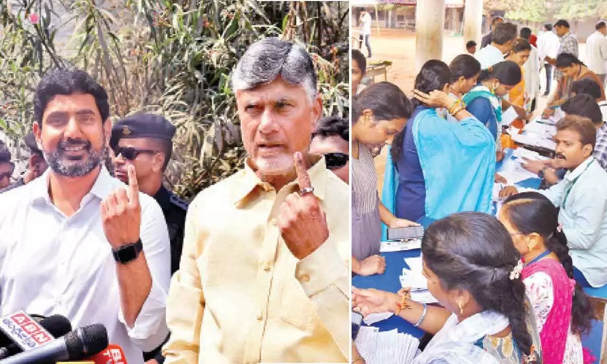 Chief Minister N Chandrababu Naidu and Minister for IT Nara Lokesh cast their votes at the Mandal Upper Primary School in Undavalli. Union Minister Dr. Pemmasani Chandrasekhar exer-cised his franchise at Ravi Sambaiah Municipal High School in Tenali.