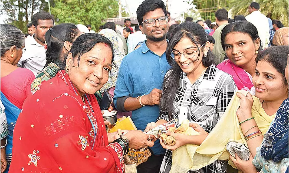 A young girl is seen accepting ‘Udyoga Rette’ from a woman at Swarnala Cheruvu in Nellore on Tuesday