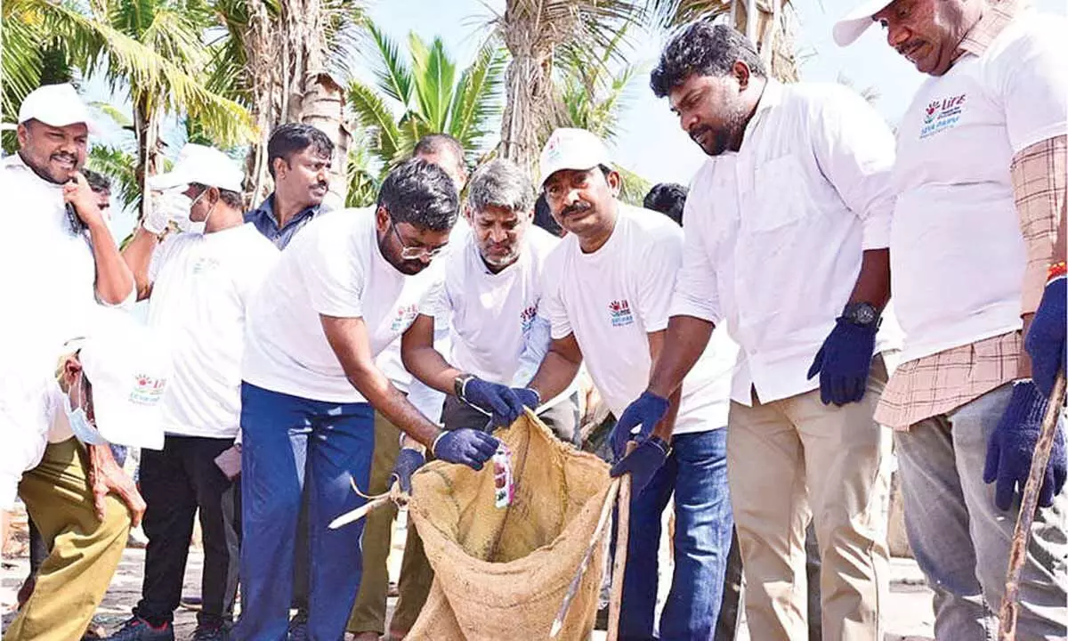 Collector DK Balaji, along with the Pollution Control Board Officials participating in the Beach Cleaning Programme at Manginapudi Beach on Saturday