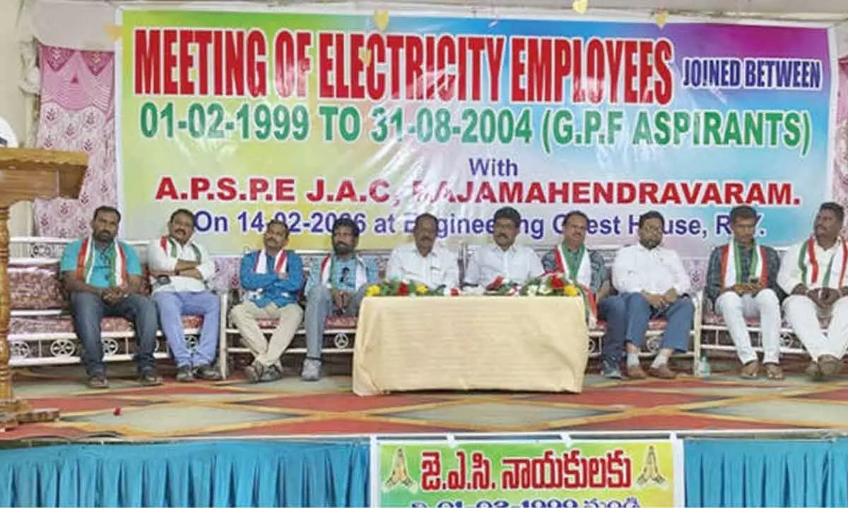 Rajamahendravaram: Electricity employees have renewed their demand for implementation of the old GPFpension scheme for staff appointed between February 1, 1999, and August 31, 2004. The demand was raised at a meeting organised by the Electricity Employees GPF Sadhana Samithi JAC at the Electricity Engineers Association Hall here on Saturday. JAC chairman V V S Nageswara Rao and secretary B S S Venkateswara Rao said employees appointed during the said period were denied the old GPF pension despite being eligible under the rules then in force.