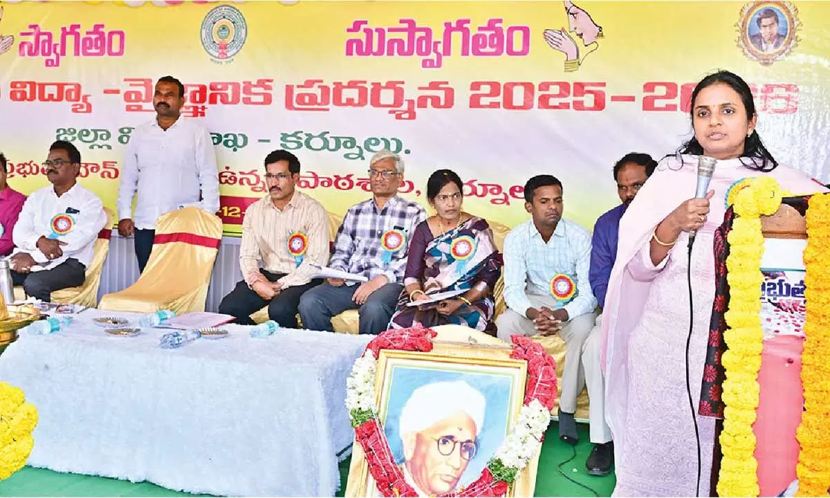 Kurnool: District Collector Dr A Siri inaugurated district-level science exhibition organised by education department at Government Town Model High School in Kurnool on Saturday. She paid floral tributes to Nobel laureate CV Raman and closely examined scientific models, experiments, and innovative projects displayed by students.