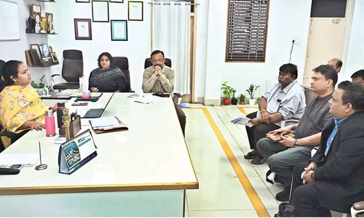 Municipal Corporation Commissioner N Mourya holding a meeting with officials in Tirupati on Tuesday