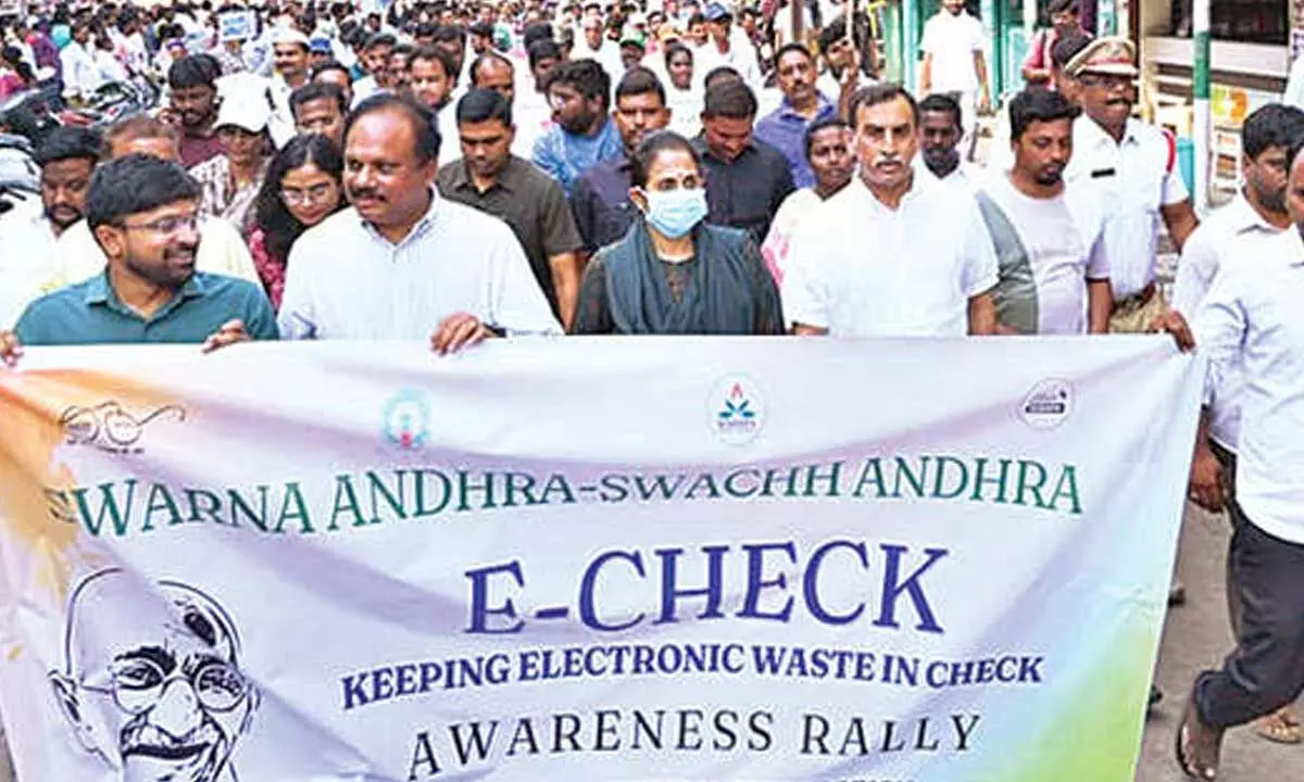 Kadapa: As part of Swachh Diwas, district Collector Dr Sridhar Cherukuri, along with MLA and Government Whip R Madhavi Reddy launched E-Check initiative — a drive to collect electronic waste from households and commercial establishments in Kadapa on Saturday. A massive Swachhata rally was flagged off from 7 Roads circle to One Town Circle involving officials, students, women’s groups, and public.
