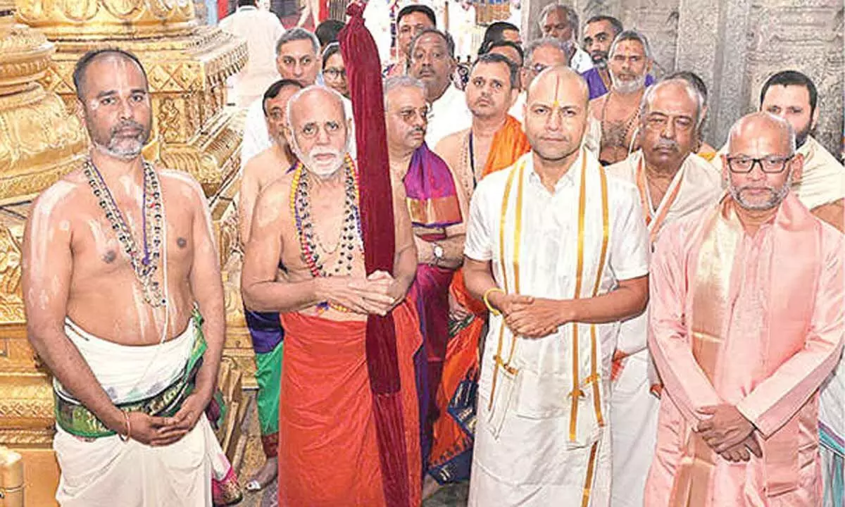 He was received at the Sacred Fig tree located near Old Annaprasadam Complex as per temple traditional honours (Pedda Maryada). Later TTD EO Anil Kumar Singhal, Addl EO Ch Venkaiah Chowdary welcomed the seer, while the archakas took the Pontiff to Bedi Anjaneya Swamy temple with Isthikapal honours.