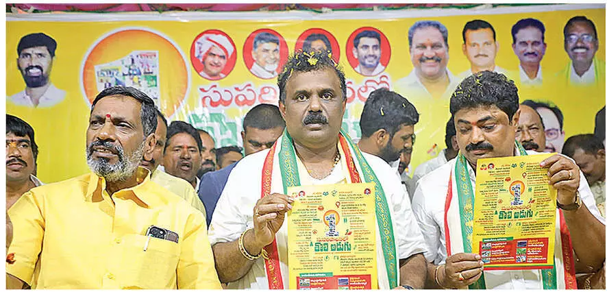Minister Angani Satya Prasad, TDP district president G Narasimha Yadav and Satyavedu coordinator K Sankar Reddy taking part in ‘Suparipalana lo Tholi Adugu’ programme in Tirupati on Monday