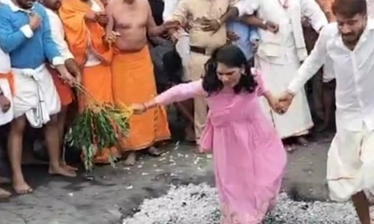 Hassan, (Karnataka): Deputy Commissioner (DC) of Hassan district K.S. Latha Kumari won hearts by taking part in the daring fire-walking ritual at the famous Hasanamba Temple premises in Hassan city of Karnataka, on Thursday. Her participation in the ritual has drawn widespread appreciation from devotees, and the video of DC Latha Kumari walking over the burning coals has gone viral on social media.
