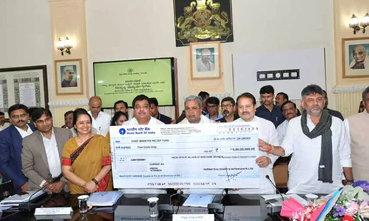 On behalf of the public limited enterprise, Large and Medium Industries Minister M.B. Patil and Karnataka Soaps and Detergents Limited Chairman Appaji Nadagouda presented the cheque to Karnataka Chief Minister Siddaramaiah at the Conference Hall of Vidhana Soudha.