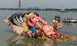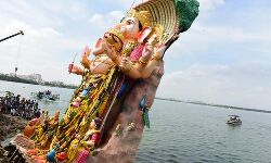 Amidst chanting of Ganapati Bappa Morya adieu for Mahaganapati is completed as the 70 ft idol was slowly immersed in Husssin Sagar at 13.40 pm