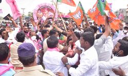 Tension prevailed in Jangaon district on Wednesday, when the BJP activists tried to obstruct the burning of PM Modi effigy, the TRS activists manhandled the BJP workers and rushed them. Noticing the incident, Jangaon Town police personnel intervened and controlled the situation after arresting the BJP cadre.