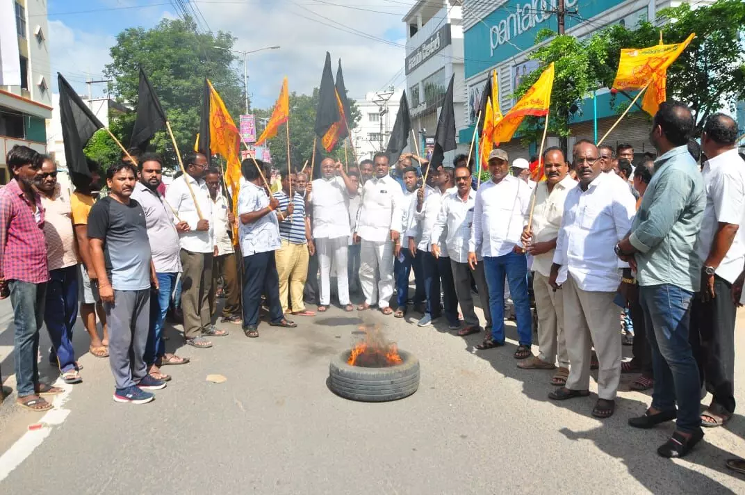 Guntur Lakshmipuram Main Road Protesting against the arrest of former Chief Minister Nara Chandrababu at 8 am today in the city at 8 am, protesting by burning tires on the road and protesting Kovelamudi Nani and Telugu Desam activists with black flags