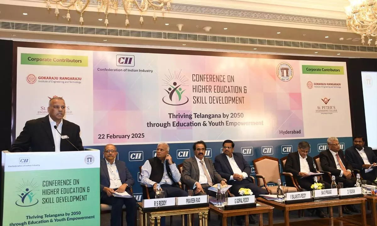 Under the theme ‘Thriving Telangana by 2050 through Education & Youth Empowerment’, the conference was held in collaboration with Telangana Development Forum (TDF) and was also addressed by Senior Government officials. During his welcome address in the inaugural session D Sai Prasad, Chairman, CII said that as the State moves towards a more technologically advanced and sustainable economy, several sectors stand out for their growth potential and ability to drive job creation through 2050 and beyond. “There is a need for a shift towards skill based multidisciplinary education. For developing Telangana as a global education hub, there is a need for policy transformation and governance. With the present proportion of skill development, the industry will not be able to sustain itself for 30 years from now. Hence we started a series of training sessions across the State. There is need for fundamental balance and even farmers should be engaged in the transition by engaging them part time for MSMEs,” he felt.