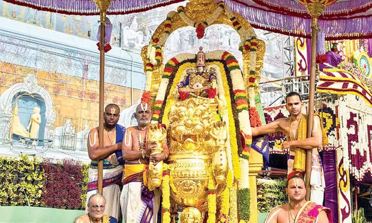 Tirumala: The Simha Vahana Seva was observed with a celestial grandeur in Tirumala on the third day as a part of ongoing annual Brahmotsavams on Friday.