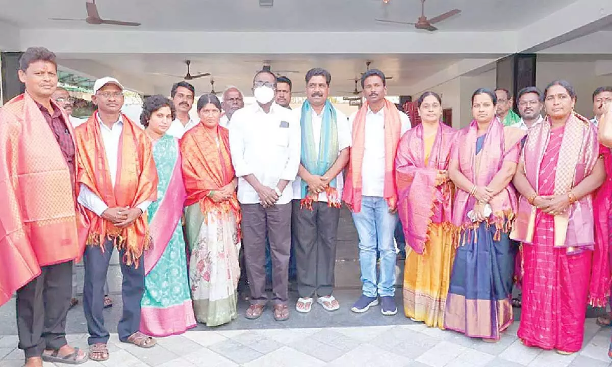 Khammam: Formerminister Puvvada Ajay Kumar felicitated newly elected councillors of the BRS and its alliance partners here on Saturday following their victory in the recent municipal elections to the Wyra Municipality.