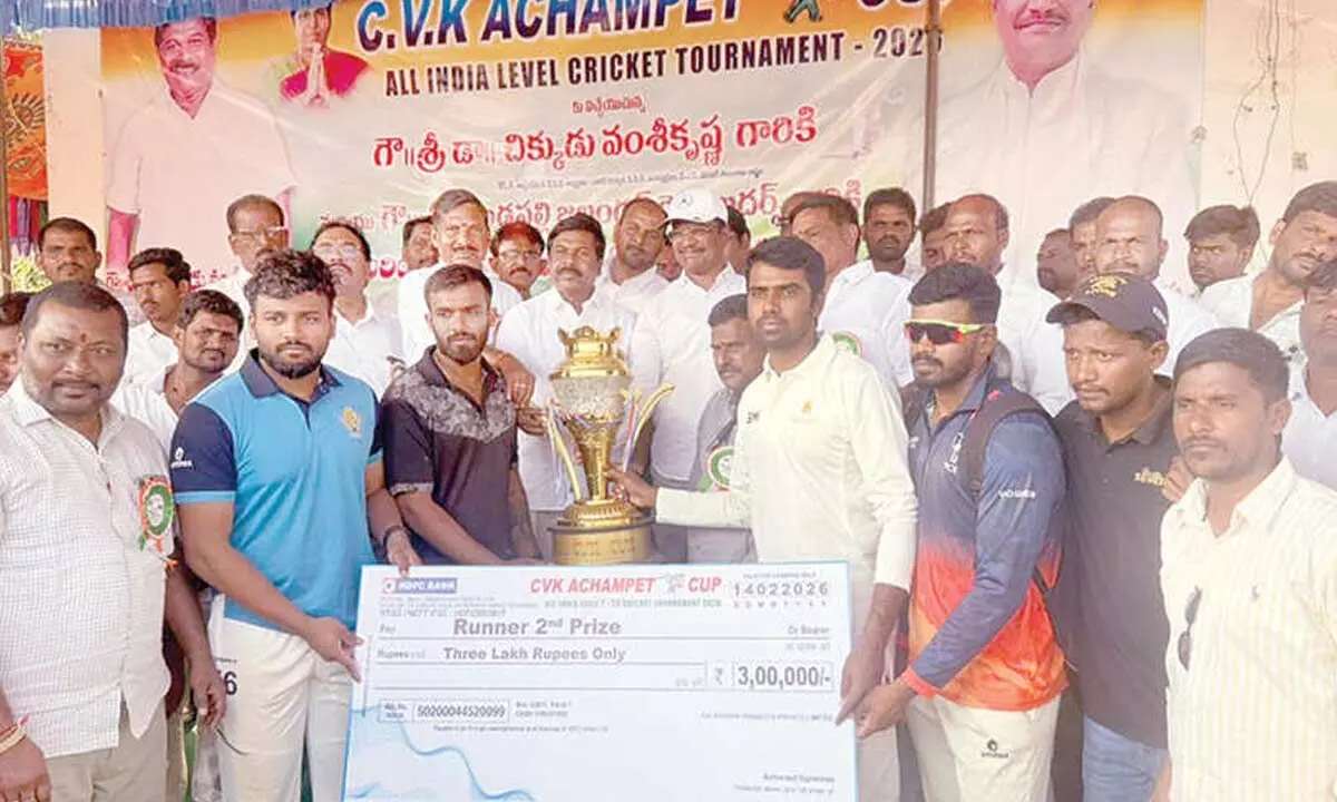 Achampet: The week-long CVK Cup All-India Level Cricket Tournament concluded on a grand note at the Rajiv–NTR Stadium in Achampet, drawing enthusiastic participation from teams across the country and a large turnout of cricket lovers from the Nallamala region.
