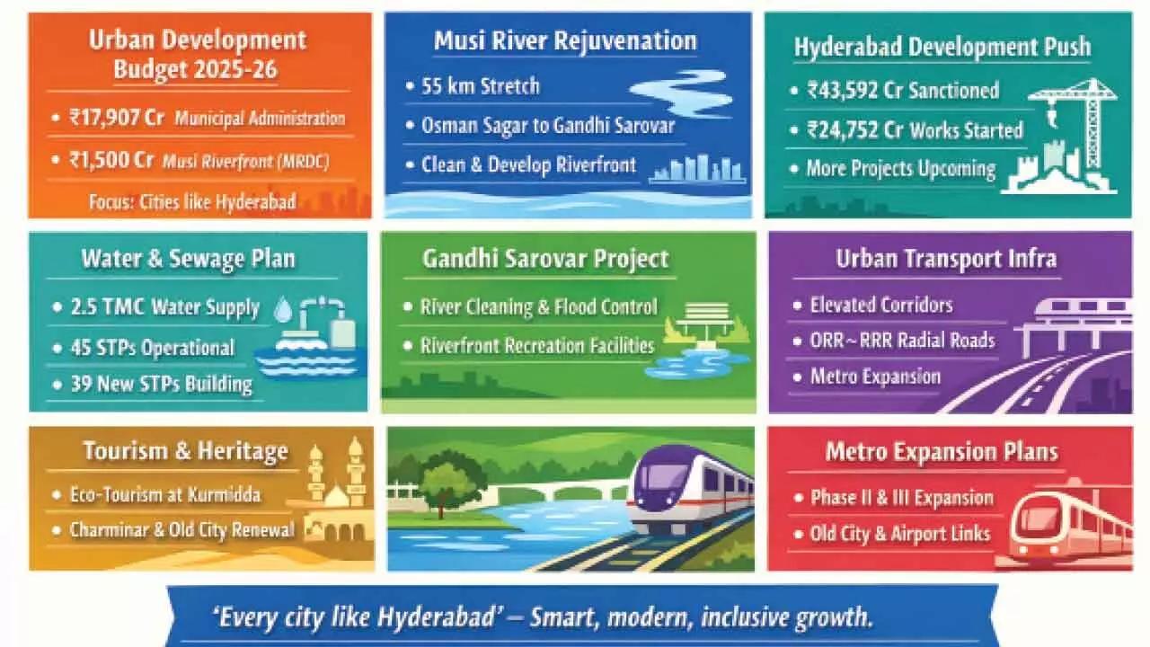 The Musi Riverfront Development Corporation (MRDC) has got substantial allocations in the budget this year as the government earmarked Rs 1,500 crore. The government has allocated as many as Rs 17,907 crore for the municipal administration and urban development department.