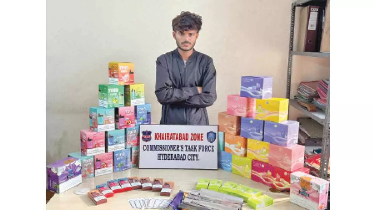 The Hyderabad Commissioner’s Task Force and Mangalhat police have successfully dismantled an illegal e-cigarette racket operating in Dhoolpet. During a targeted raid on a residence in Lower Dhoolpet, officers arrested a 23-year-old student and seized 282 electronic cigarettes and vapes valued at approximately Rs 8.72 lakh. The confiscated contraband included various prohibited brands such as Yuoto Beyonder, Elfbar, and Raya D1.