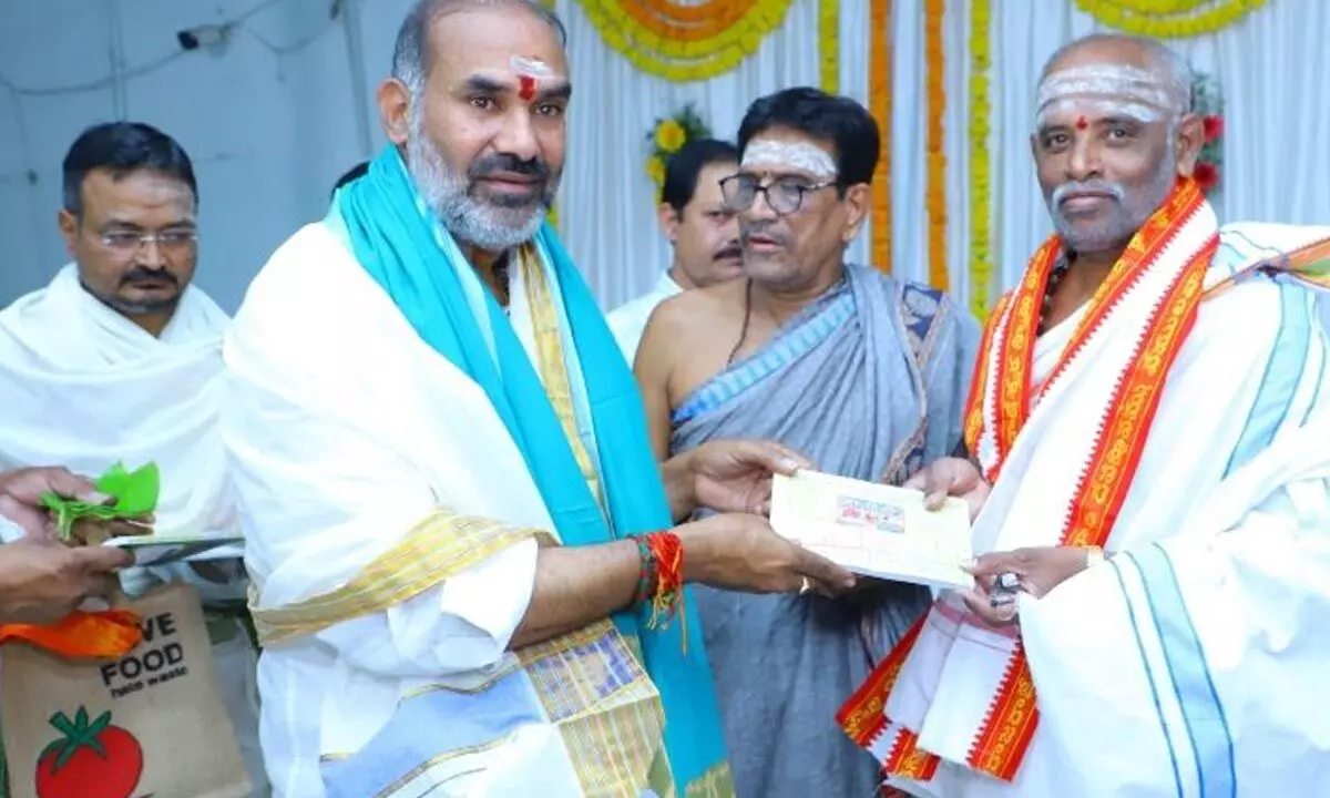 Sircilla: Sri Rama Navami celebrations started on Sunday in Vemulawada Sri Rajarajeswara Swamy temple, the largest Shaivite temple in Telangana.As part of the festival, temple priests under the direction of Appala Bhima Shankar Sharma, the temple head priest,began the festivities with Swasti Punyaha in the temple of Sri Sitaramachandra Swamy.