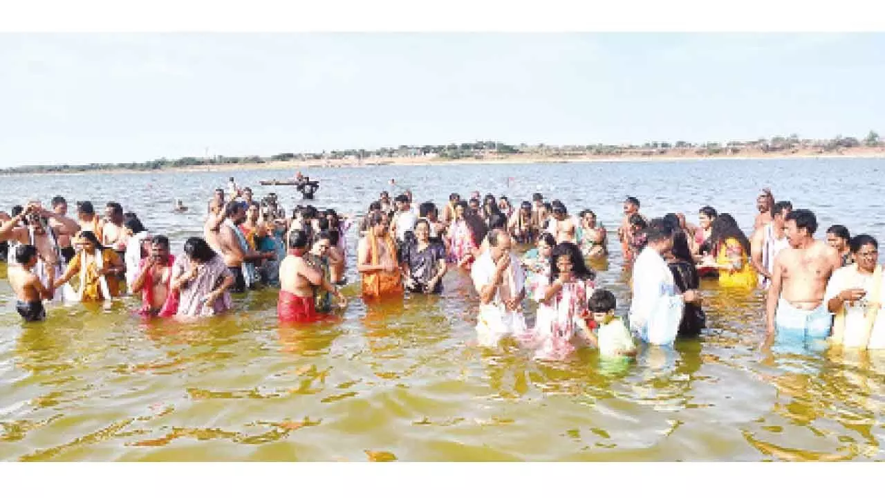 BHUPALAPALLY: On the 6th day—Tuesday—the Triveni Sangamam buzzed with the influx of devotees. In the vast expanse of the confluence and in the hidden channels of the Saraswati River, hundreds of thousands partook in the holy dip. Those who performed the Pushkara bath in the sanctified waters of the Saraswati are now offering their water oblations as a mark of purification.
